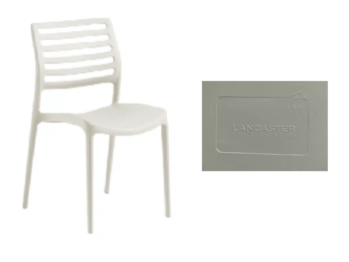 The recall concerns Lancaster Table & Seating brand Allegro plastic side chairs designed for outdoor use. These chairs are available in 14 colors and bear the Lancaster Table & Seating stamp underneath. They are made of glass reinforced polypropylene, measuring approximately 17 inches in width and 33 inches in height.